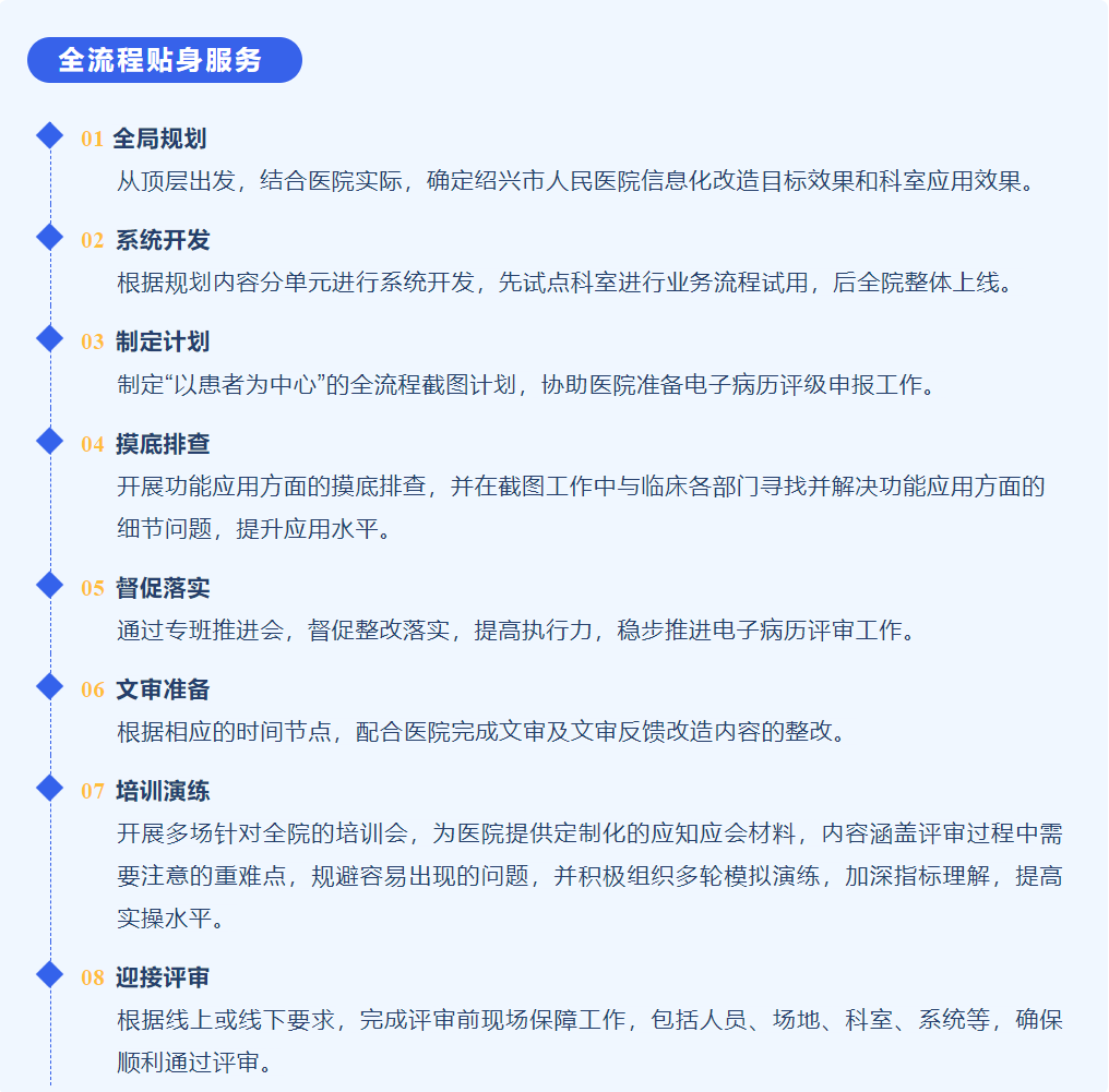 經(jīng)過多年的積累,公司凝聚了一支包含醫(yī)院信息化專家、評(píng)級(jí)咨詢專家、特聘知名業(yè)內(nèi)專家顧問等在內(nèi)的專業(yè)評(píng)級(jí)項(xiàng)目團(tuán)隊(duì),負(fù)責(zé)詳細(xì)解讀電子病歷評(píng)審標(biāo)準(zhǔn),結(jié)合紹興市人民醫(yī)院實(shí)際工作流程,在院領(lǐng)導(dǎo)的統(tǒng)一指揮下,協(xié)同質(zhì)控處、醫(yī)務(wù)處、信息中心、護(hù)理部及院內(nèi)其他職能部門建立以提升臨床醫(yī)療質(zhì)量為目標(biāo)的專項(xiàng)小組,組織各臨床部門、臨床醫(yī)技醫(yī)輔、臨床醫(yī)護(hù)人員參與業(yè)務(wù)討論,進(jìn)行“符合評(píng)審標(biāo)準(zhǔn)、結(jié)合醫(yī)院特色、提高臨床使用”的業(yè)務(wù)流程改造。