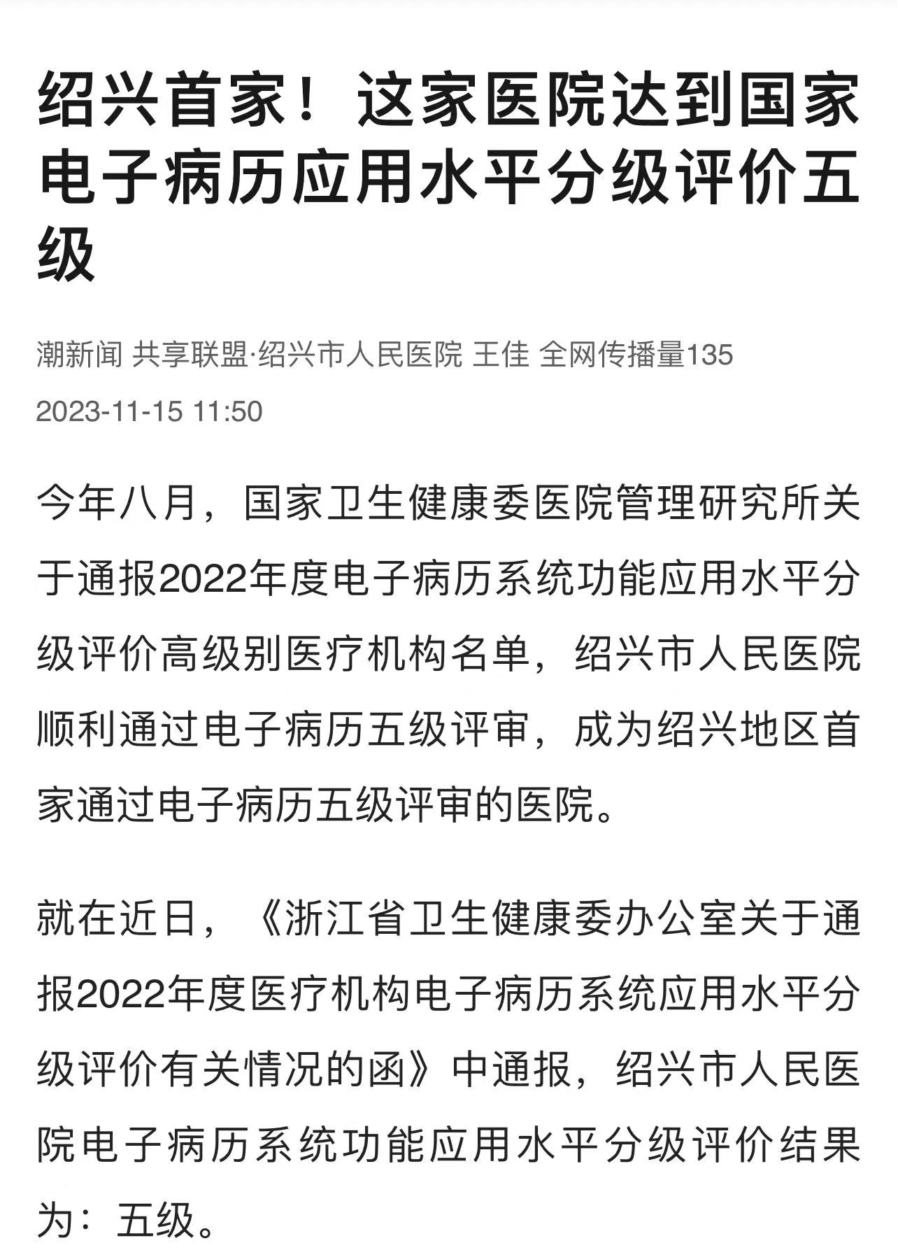2023年8月8日,國(guó)家衛(wèi)生健康委醫(yī)院管理研究所關(guān)于通報(bào)2022年度電子病歷系統(tǒng)功能應(yīng)用水平分級(jí)評(píng)價(jià)高級(jí)別醫(yī)療機(jī)構(gòu)名單,紹興市人民醫(yī)院順利通過電子病歷五級(jí)評(píng)審,成為紹興地區(qū)首家通過電子病歷五級(jí)評(píng)審的醫(yī)院,標(biāo)志著紹興市人民醫(yī)院在智慧醫(yī)院建設(shè)、數(shù)字信息化、醫(yī)療質(zhì)量水平、醫(yī)院管理效能等領(lǐng)域邁上了一個(gè)新的臺(tái)階。