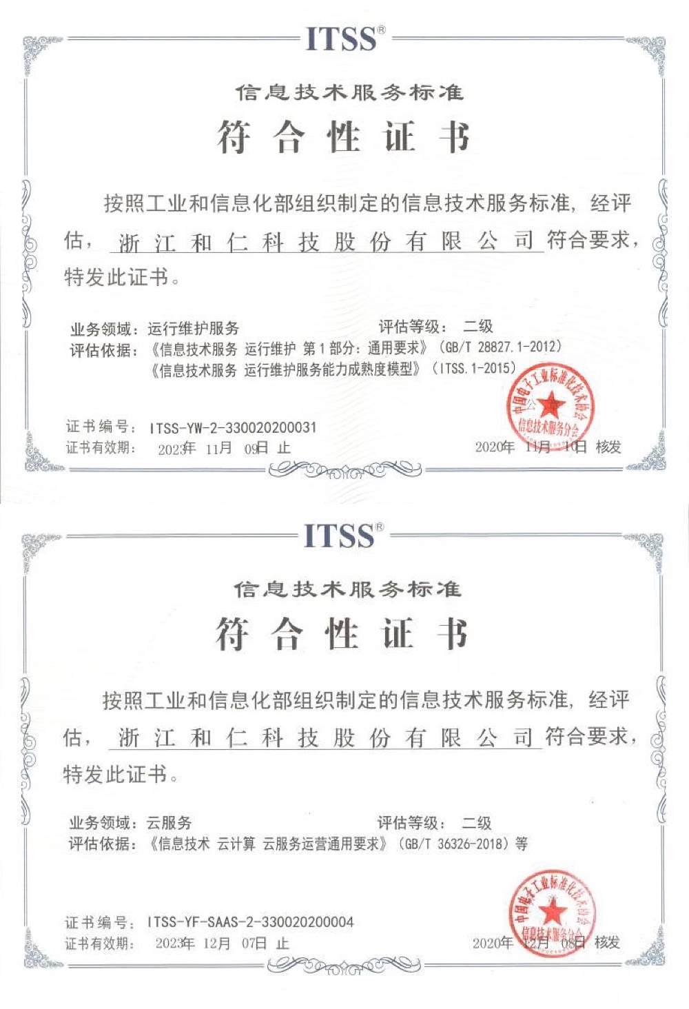 和仁科技|順利取得運(yùn)行維護(hù)服務(wù)二級、云服務(wù)二級符合性證書