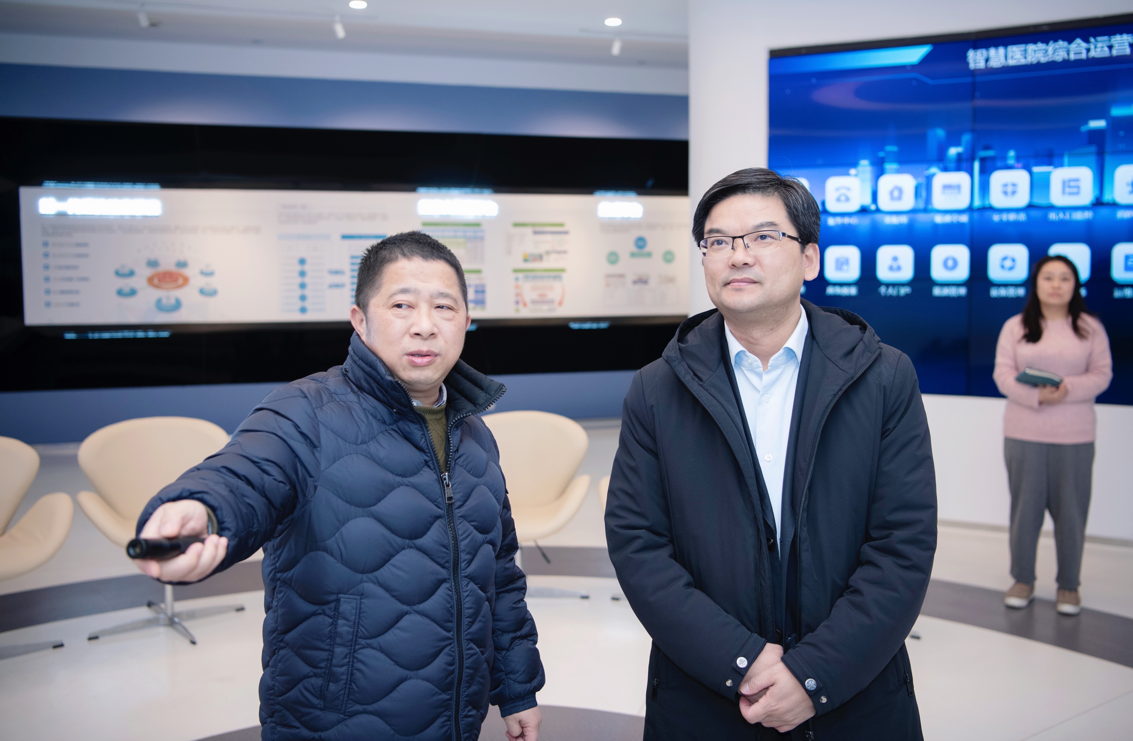 李志龍區(qū)長(zhǎng)一行參觀了和仁科技智慧醫(yī)療展廳,聽取了企業(yè)的發(fā)展歷程、戰(zhàn)略規(guī)劃及企業(yè)在智慧醫(yī)療領(lǐng)域取得的成績(jī),了解了“城市大腦·舒心就醫(yī)”的主要功能、實(shí)際效果等。